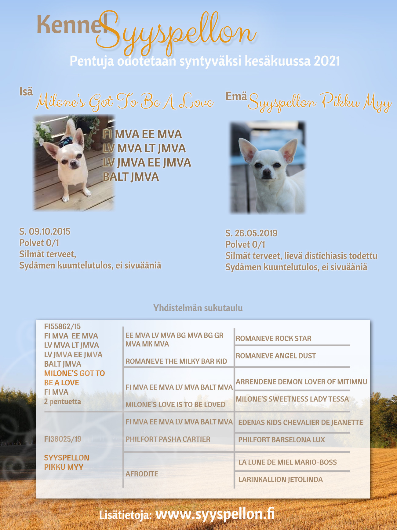 Pennut syntyivät 14.06.2021; 3u ja 1n. Täältä löydät isän tiedot. Täältä löydät emän tiedot.